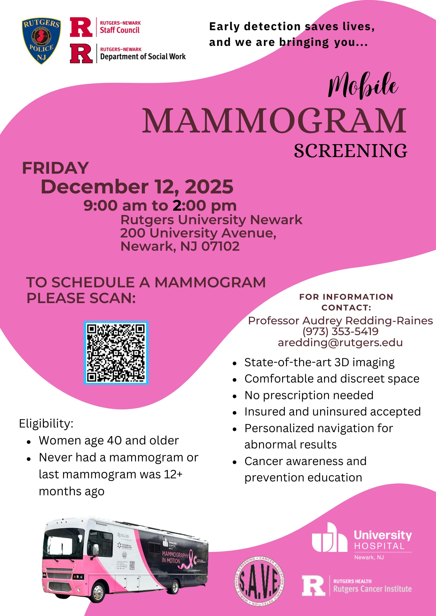 Early detection saves lives! Friday, DECEMBER 12, 2025 9:00 am to 2:00 pm 200 University Avenue Newark, NJ 07102 REGISTRATION Eligibility: Women age 40 and older Never had a mammogram … Read More
